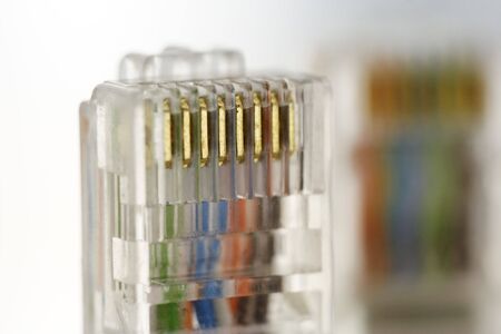 plastic connector RJ 45 for connection to a computer network, macro abstract background