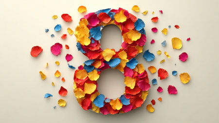 Greeting card design showcases a large number eight surrounded by colorful rose petals for International Women