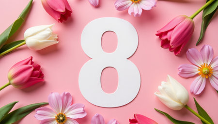 Textured number 8 surrounded by tulips and mimosa on pink background, cheerful elegance. generated by ai