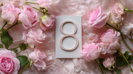 This beautiful composition features soft pink roses framing the number eight on a gentle fabric background, ideal for a variety of occasions and celebrations.