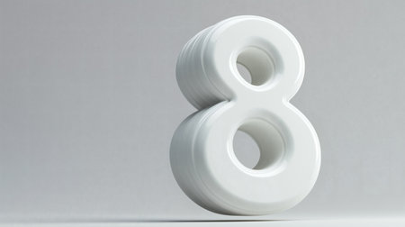 A layered 3D rendering of the number 8 in glossy white, featuring stacked textures and a modern aesthetic. Ideal for creative design and branding projects.