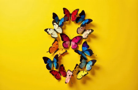 Creative card with Number 8 made from colorful butterflies beautifully displayed against a vibrant yellow background