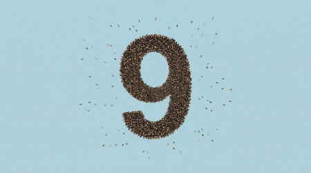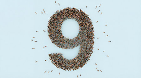 Massive collection of human bodies shaping numeral nine sign indicating count, sequence, or specific score from overhead perspective.