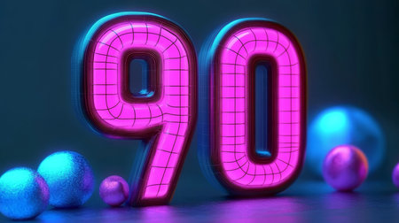 Glowing Digital 3D Number 90 On An Abstract Background With Futuristic Pink Neon Lights And Spheres