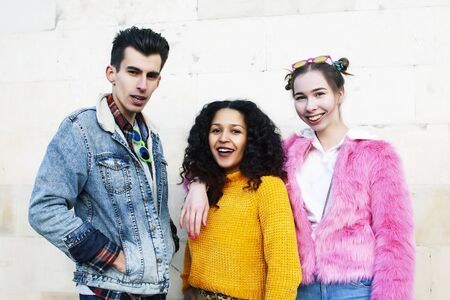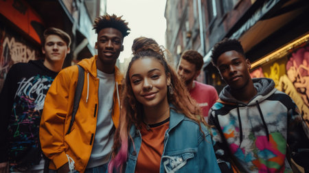Friends, fashion and gen z, people in portrait and diversity, relax on sidewalk and casual, cool and young. Students, urban streetwear style and friendship, trendy clothes and together outdoor