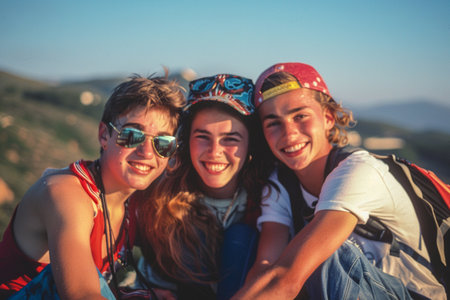 A group of stylish individuals dressed in retro-inspired outfits relaxing outdoors and showing camaraderie. The vibrant colors and accessories contribute to a sense of friendship and nostalgic lifestyle.