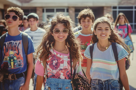 Nostalgic school days: a vibrant glimpse into the 1990s with schoolchildren and teenagers, capturing the essence of youth culture, education, friendships, and iconic fashion.