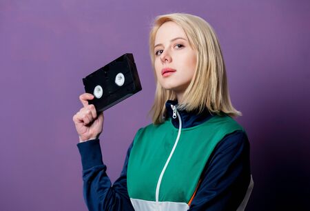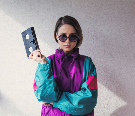 Young sporty woman 80 and 90s style. 90s fashion positive girl dvd cassette