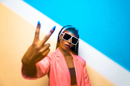 90s style concept. Young woman with pink hail holding glasses and cassette standing in the blue colored studio.