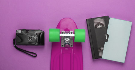 Summer fun. Youth flat lay. Cruiser board with a retro camera, video cassette on yellow background. Retro 80s. Top view
