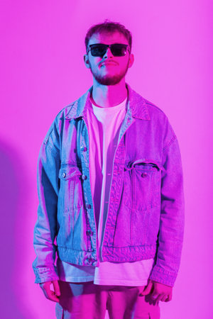 Trendy creative young handsome man with sunglasses in denim fashion jacket in the colorful studio with pink and blue light