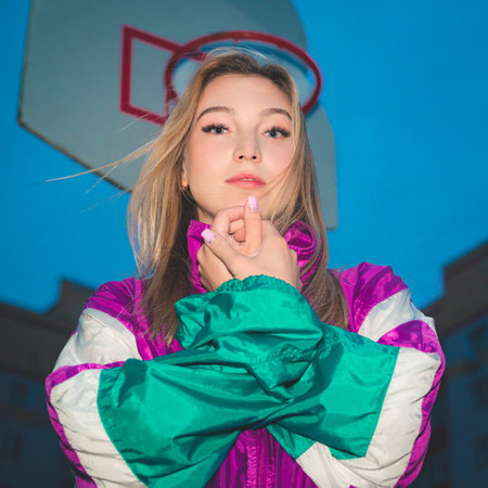 Woman wearing a vibrant retro jacket is standing on a basketball court with hands in a position, under a basketball hoop, background a blue sky.