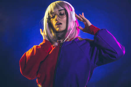 A fashionable girl in bright colorful retro-style clothes on a blue background enjoys the atmosphere of the 80s - 90s.