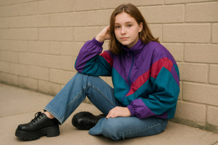 Young woman with colorful vintage jacket and platform shoes sitting on the ground near a brick wall, embodying the style of the 1990s