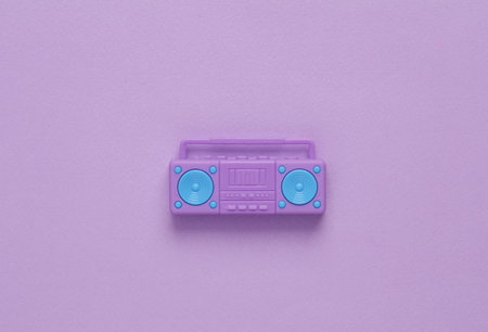 A vintage pink boombox with a double cassette deck and antenna sits in front of a colorful, abstract background. The background features bright blue, green, and yellow shapes, evoking a strong 1980s or 1990s retro style.