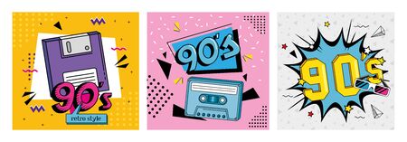 Bright doodle set of items from the nineties - retro cassette tape, sports jacket, tape recorder, roller skate, TV, joystick, floppy disk, cool and wow stickers, lightnings. Nostalgia for the 1990s.