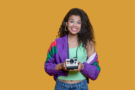 Retro style. Pretty dark-haired young girl holding an old camera and smiling