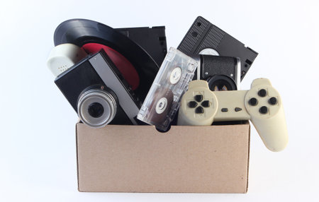 Cardboard box with video cassettes, retro film camera, vinyl record, audio cassette, gamepad on a white background. Antiques, trash