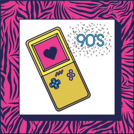 Retro 1990s style poster with bold frame decorated by cartoon stickers of boombox, vinyl, candy machine, CD, disco ball and more. Nostalgic fun vibe perfect for youth designs and party themes.