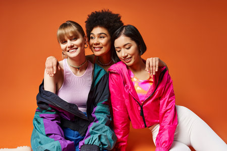 A group of beautiful, multicultural women stand together against an orange studio background, exuding confidence and solidarity.