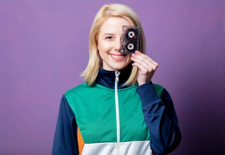 Style blonde woman in 80s clothes with tape cassette on purple background