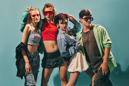 Stylish youth group standing together in colorful retro streetwear and sunglasses against turquoise background