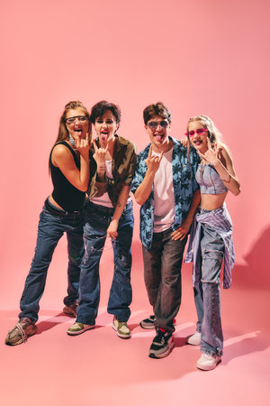 Group of happy young friends showing rock signs and sticking tongues out on pink background in casual outfits