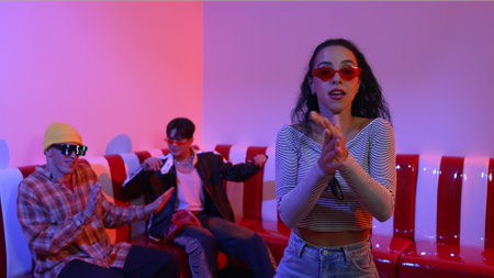 Close up of asian street dancer moving to pop music with neon light while diverse friend sitting and support performance. Professional performer practicing dancing step to beat at studio. Regalement.