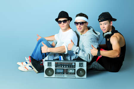 Confident young friends standing close in casual streetwear with colorful sunglasses on blue background