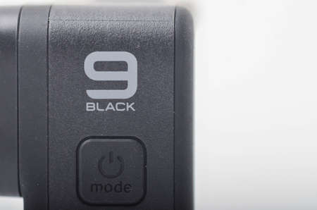 Kuala Lumpur, Malaysia - April 30, 2021: Close up view of new flagship action camera gopro 9 black on white background. Selective focus.