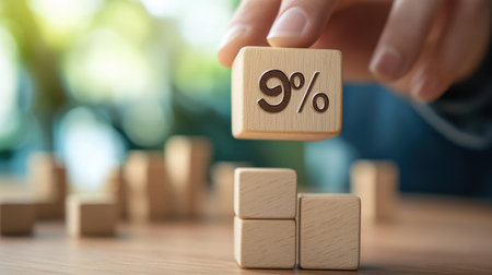Hand holding a wooden cube with a percent sign, with more cubes in the background, symbolizing finance choices