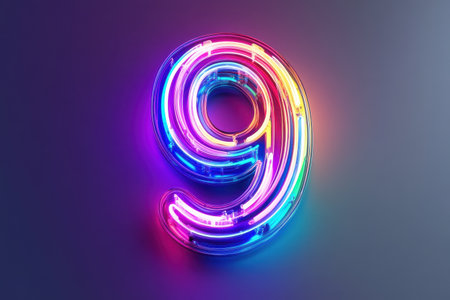 A neon sign with the number nine in neon colors. The sign is illuminated and stands out against a dark background