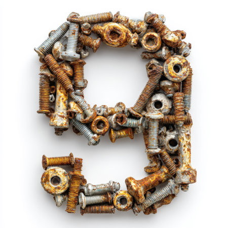 The number nine, formed from a pile of old, rusty metal screws and bolts, isolated on a white background. This design is perfect for an industrial or grunge theme.