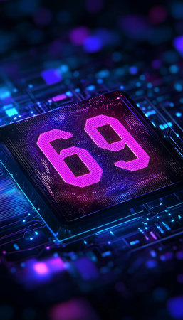 Glowing Digital 3D Number 69 on Futuristic Circuit Board Design, Technology Background