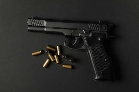 Automatic pistol hand gun with bullets and handcuffs on black background