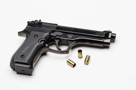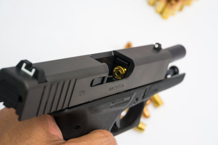 9mm automatic micro sompact pistol with bullet on white background home defence