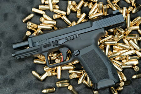 Close up of 9 mm. bullets with semi automatic pistol hand gun background , Pocket gun