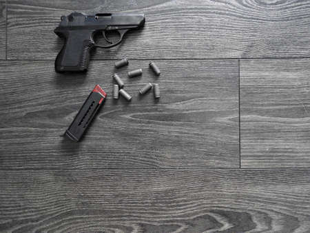Still life with black handgun with cartridge magazine on old grungy brown wooden background, Black semi-automatic pistol on wood table