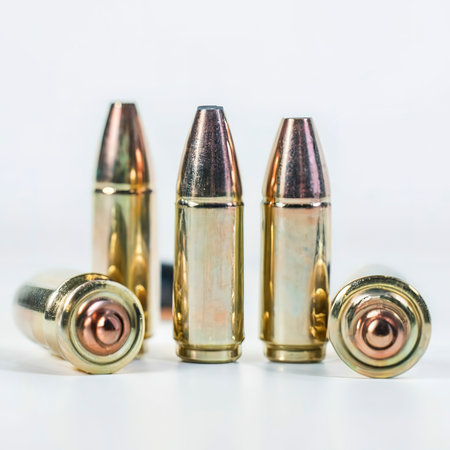 Scattered bullets on a white background. Concept of ammunition, firearm safety, military gear, crime investigation.