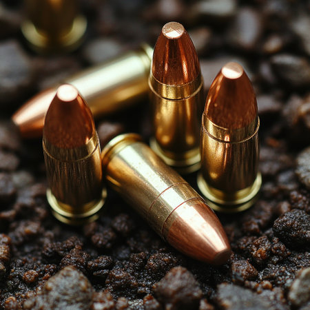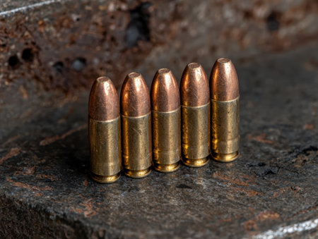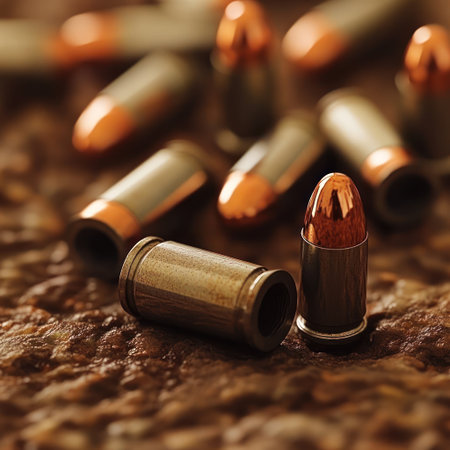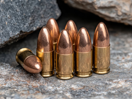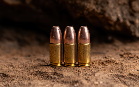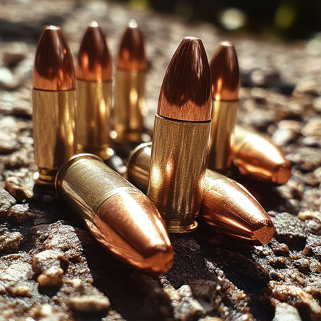 Bullets rest on a rugged surface, reflecting warm tones in a focused arrangement.