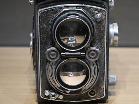 closeup old 35 mm film roll on wooden desktop with vintage camera in the background.
