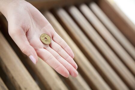 Japan currency 5 yen coin use for praying in japanese shrine with bokeh background.
