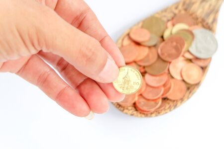 Hand holding full of coins palm payment donation concept economy finance
