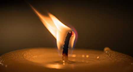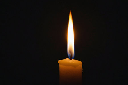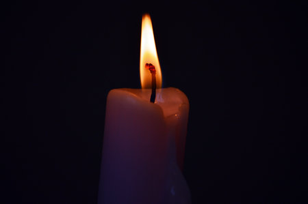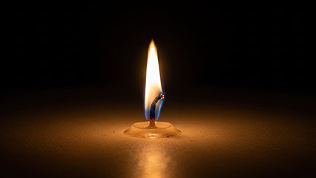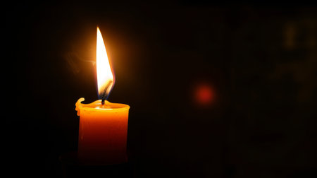 Single candle flame burning brightly, illuminating the dark with a warm, soft glow. melted wax surrounds the wick, creating a peaceful and intimate atmosphere, symbolizing hope and remembrance.