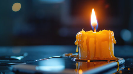 A striking close-up of a melting yellow candle with a flickering flame, casting a warm glow on a smartphone, creating a serene and cozy atmosphere.