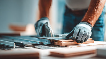 Close-up image of a worker wearing work gloves operating a circular saw to cut pieces of wood on a workbench. The image emphasizes the precision and detail of the work being done.