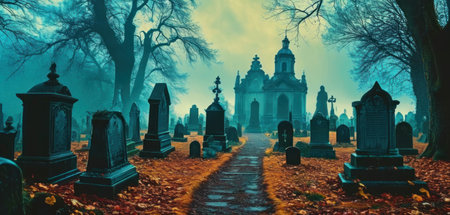 Panoramic view of spooky old graveyard with church on the background.