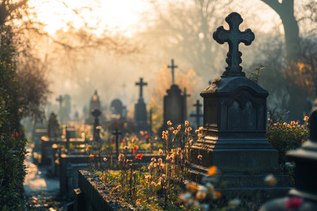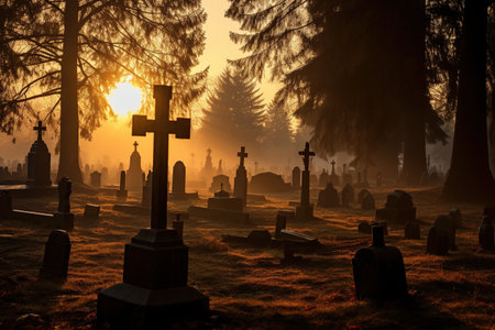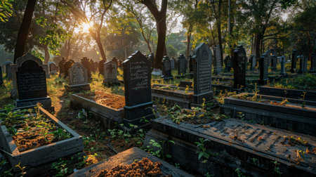 As the sun rises, its golden rays pierce through the morning mist, illuminating the silent silhouettes of headstones and a solitary cross in an old cemetery.