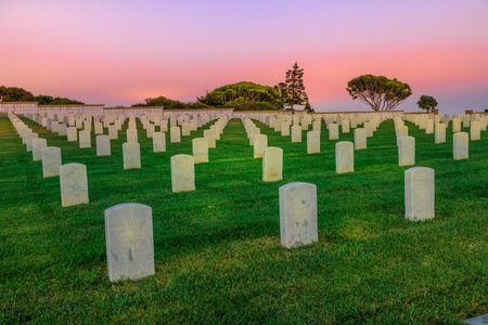 San Diego, California, United States - July 31, 2018: Cemetery graveyard white tombstones with sunrays in orange sunset sky. American war cemetery in Point Loma, San Diego, California, United States.