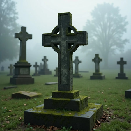 Amidst the dense fog, moss envelops weathered gravestones in an abandoned cemetery.